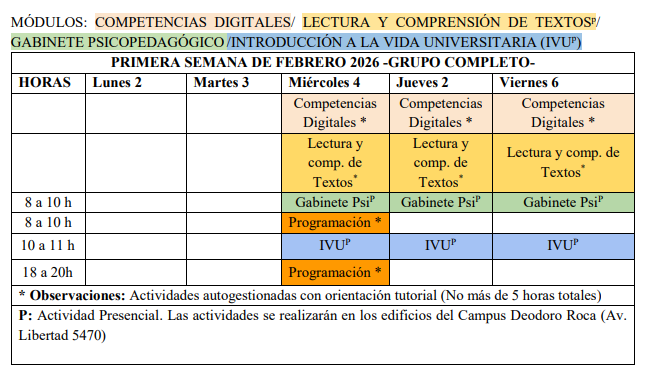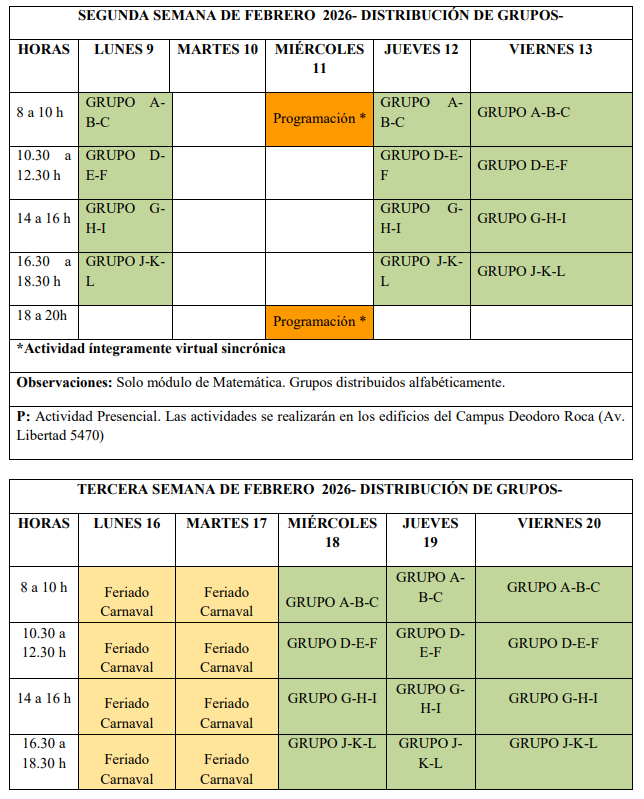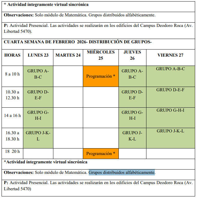 Modalidad presencial: El horario será designado según grupos distribuidos alfabéticamente. Próximamente, más información sobre la distribución corresondiente..