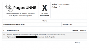 Comprobante del pago del Arancel: Arancel por la emisión de Diploma Decorativo por la suma de $150.000 RES – 2025 – 7936 – REC # UNNE. El comprobante debe presentarse en formato de factura (ver imagen).